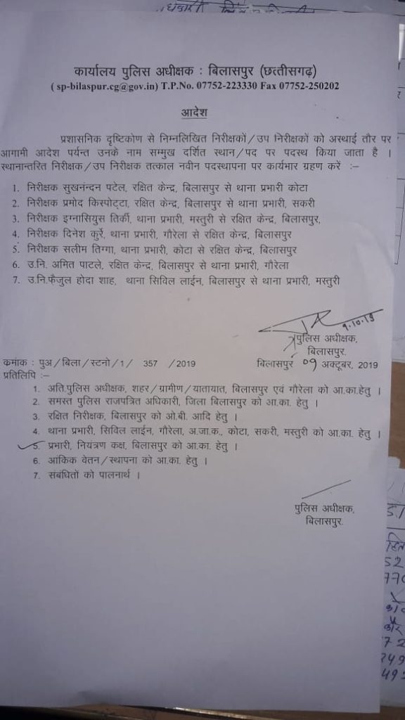 बिलासपुर/कोटा, पुलिस कप्तान बिलासपुर ने निरीक्षकों/उप निरीक्षकों का विभागीय फेरबदल किया है। अस्थाई तौर पर आगामी आदेश पर्यन्त तक पदस्थ किया गया है। जारी आदेश के अनुसार निरीक्षक सुखनन्दन पटेल को कोटा थाना प्रभारी बनाया गया। वहीं वर्तमान थाना प्रभारी सलीम तिग्गा को रक्षित केन्द्र बिलासपुर स्थानांतरित किया गया।