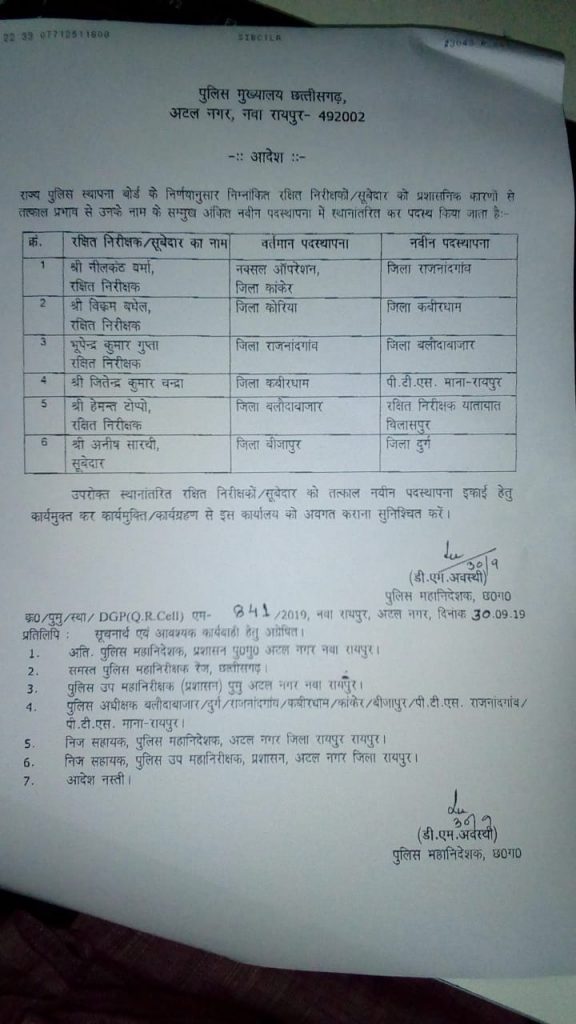 रायपुर 01.09.2019, प्रदेश के पुलिस विभाग में लगातार तबादले का दौर जारी है। पुलिस मुख्यालय नवा रायपुर से जारी आदेश में पांच निरीक्षकों व एक सूबेदार का तबादला किया गया है। इन पुलिस कर्मियों को तत्काल नवीन पदस्थापना स्थान पर कार्यभाल संभालने के निर्देश दिए हैं।