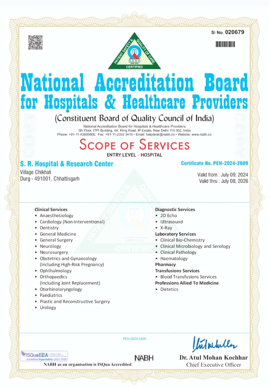 अतुल शर्मा दुर्ग जिले के प्रतिष्ठित एस आर हॉस्पिटल एण्ड रिसर्च सेन्टर चिखली को NABH द्वारा मान्यता प्रदान की गई हैं । यह अस्पताल दुर्ग जिले का सबसे बड़ा 180 बिस्तरों का सुपर स्पेशलिटी एवं सर्वसुविधा युक्त अस्पताल है। अस्पताल में आयुष्मान भारत योजना एवं ESIC योजना व भारतीय रेल्वे एवं केन्द्र एवं राज्य सरकार के कर्मचारीओं व विभिन्न हेल्थ इन्श्योरेन्स कम्पनी के हितग्राही मरीजों का कैशलेस ईलाज किया जाता है । अस्पताल मे ICU एवं NICU व अन्य सभी सुविधाएँ उपलब्ध है। NABH द्वारा एनेस्थीसिया कार्डीओलाजी जनरल मेडीसीन जनरल सर्जरी आर्थो पिडियाट्रीक आप्स एण्ड गायनीक आण्थलमिक बर्न एण्ड प्लास्टीक न्युरो सर्जरी न्युरोलाँजी डेन्टलयुरोलाँजी व अन्य विभाग हेतु NABH की मान्यता प्रदान की गई हैS.R.HOSPITAL के मेडीकल सुप्रिटेन्डेन्ट डाँ एस पी केसरवानी ने बताया कि अस्पताल प्रबन्धन द्वारा NABH के सभी नियमों व निर्देशो का पालन किया जाता है जिससे हमारे अस्पताल को NABH की मान्यता प्राप्त हुई हैS.R.HOSPITAL के चेयरमेन संजय तिवारी ने इस उपलब्धि पर क्षेत्रवासियों के साथ एस आर परिवार के सभी सदस्यों को बधाई दी है