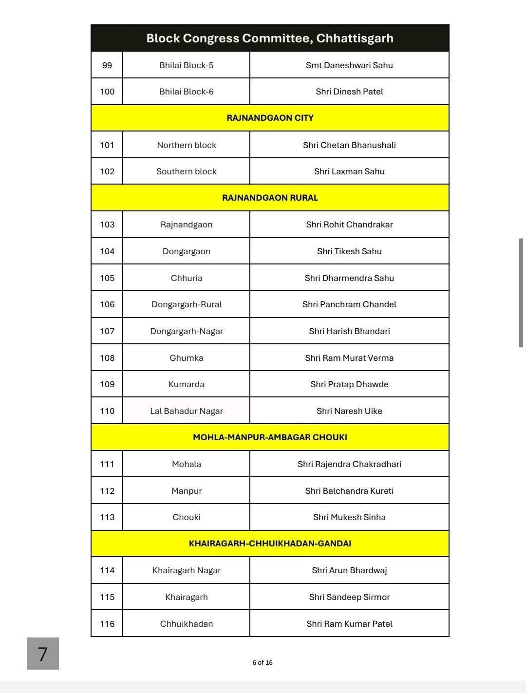 भिलाई जिले में कोसानाला (सुपेला) से नरसिंह नाथ, भिलाई ब्लॉक-1 से जी. राजू, भिलाई ब्लॉक-2 से एफ.जे. फ़रीदी (गुड्डा खान), भिलाई ब्लॉक-3 से सौरभ मिश्रा, भिलाई ब्लॉक-4 से सौरभ दत्ता तथा भिलाई ब्लॉक-5 से श्रीमती दानेश्वरी साहू को ब्लॉक अध्यक्ष की जिम्मेदारी सौंपी गई है।