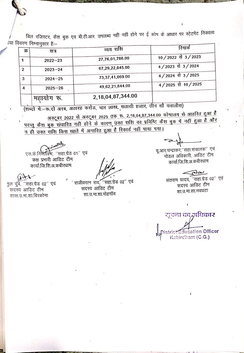 कवर्धा: शिक्षा विभाग में पिछले तीन वर्षों (अक्टूबर 2022 – अक्टूबर 2025) के दौरान कोषालय से कुल ₹2,18,04,87,344 की राशि निकाले जाने के बावजूद उसका कोई प्रमाणित लेखा-जोखा उपलब्ध नहीं है। यह खुलासा जिला शिक्षा अधिकारी एफ.आर. वर्मा द्वारा गठित ऑडिट टीम की जांच में सामने आया। ऑडिट के दौरान कई गंभीर वित्तीय कमियां उजागर हुई हैं, जिनमें कैश बुक का अधूरा होना और कई महत्वपूर्ण वाउचर एवं व्यय से संबंधित अभिलेखों का गायब होना शामिल है।